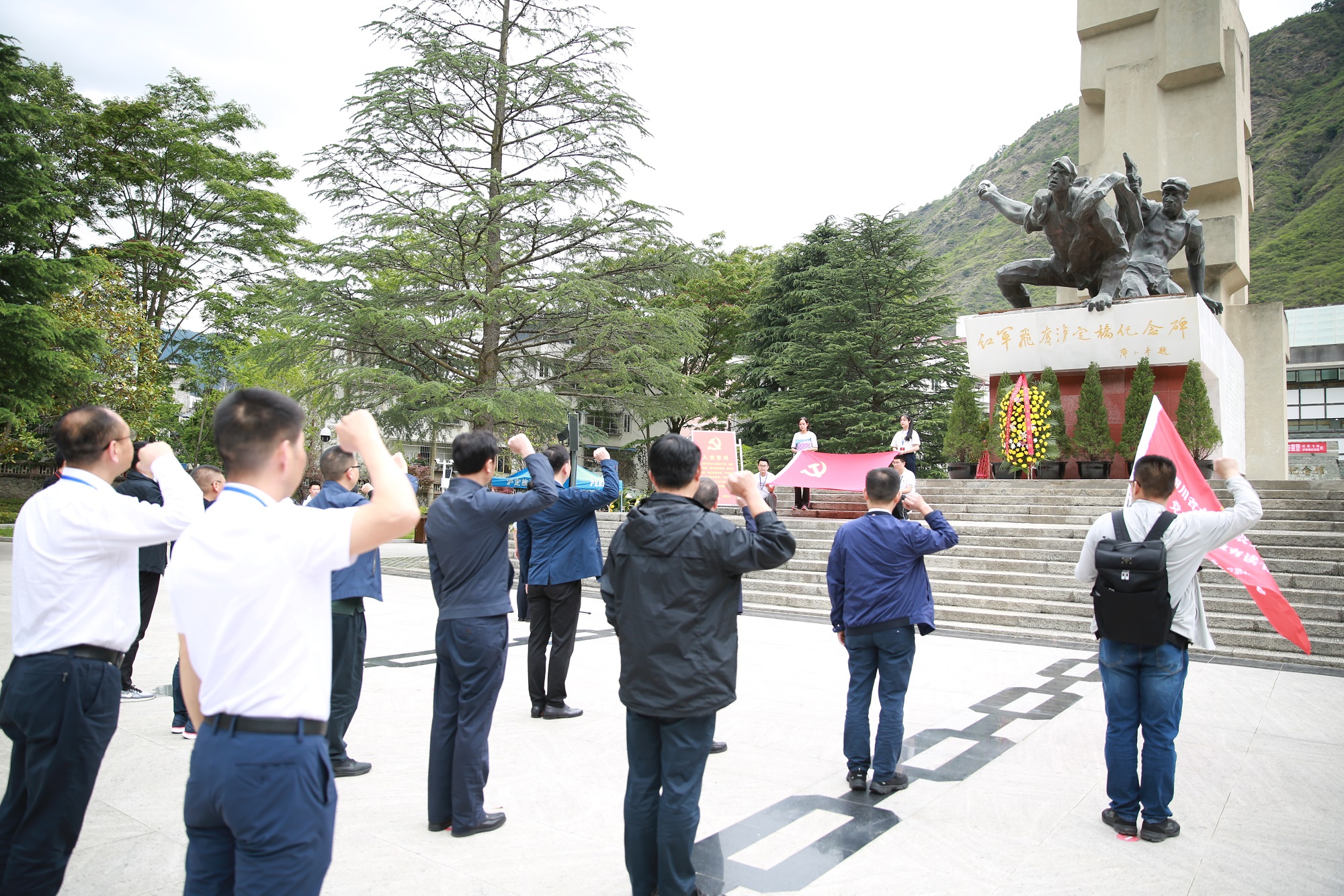 17:00,大家沿著大渡河邊行軍來到了紅軍飛奪瀘定橋紀(jì)念館。在雄偉的紀(jì)念館廣場紀(jì)念碑前,黨員們懷著無比崇敬的心情,聆聽英雄贊頌,向烈士敬獻(xiàn)花籃,重溫入黨誓詞。緊接著參觀了紅軍飛奪瀘定橋紀(jì)念館。大家緊隨解說員,認(rèn)真聆聽學(xué)習(xí),了解相關(guān)歷史背景,學(xué)習(xí)革命史。館內(nèi)豐富的圖文資料,珍貴的藏品,讓黨員們深切感受到革命先烈的堅定信念和大無畏精神。