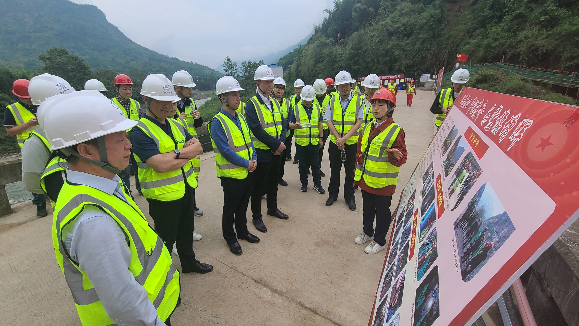 懷著昨日在瀘定緬懷革命先烈的激情,總部全體黨員干部歷經(jīng)3個半小時車程來到金雞峽壩址勘探平硐項(xiàng)目施工現(xiàn)場。下車之后,映入眼簾的是一座直沖云霄的大山、一片險象環(huán)生的懸崖峭壁。在工程局公司主要負(fù)責(zé)同志介紹項(xiàng)目概況后,項(xiàng)目部黨員同志以“初心不忘,使命召喚; 奮力拼搏,唯有圖強(qiáng)”為題,為大家上了一堂微黨課。微黨課重點(diǎn)反映了工程局公司堅持將黨建工作與項(xiàng)目建設(shè)深度融合所取得的成效,堅持“黨建融于項(xiàng)目中,黨旗立在工地上”,讓鮮紅的黨旗在施工一線高高飄揚(yáng);講述了施工建設(shè)中涌現(xiàn)的先進(jìn)黨員代表事跡;講述了在70年代艱苦歲月工程局公司修建玉溪河引水大壩的感人故事;講述了在黨員干部的先鋒模范帶領(lǐng)下,全體干部職工發(fā)揚(yáng)“不懼艱險、不畏疲勞、無私奉獻(xiàn)、勇挑重?fù)?dān)”的水利鐵軍精神,沿著既定目標(biāo),高效、安全地完成集團(tuán)交給的任務(wù)。