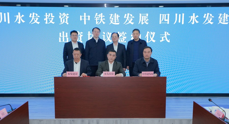 四川水發(fā)投資有限公司黨委副書記、總經(jīng)理郎波,四川水發(fā)建設(shè)有限公司副總經(jīng)理李銀剛,中鐵建發(fā)展集團(tuán)公司副總經(jīng)理劉小剛共同簽署出資協(xié)議。