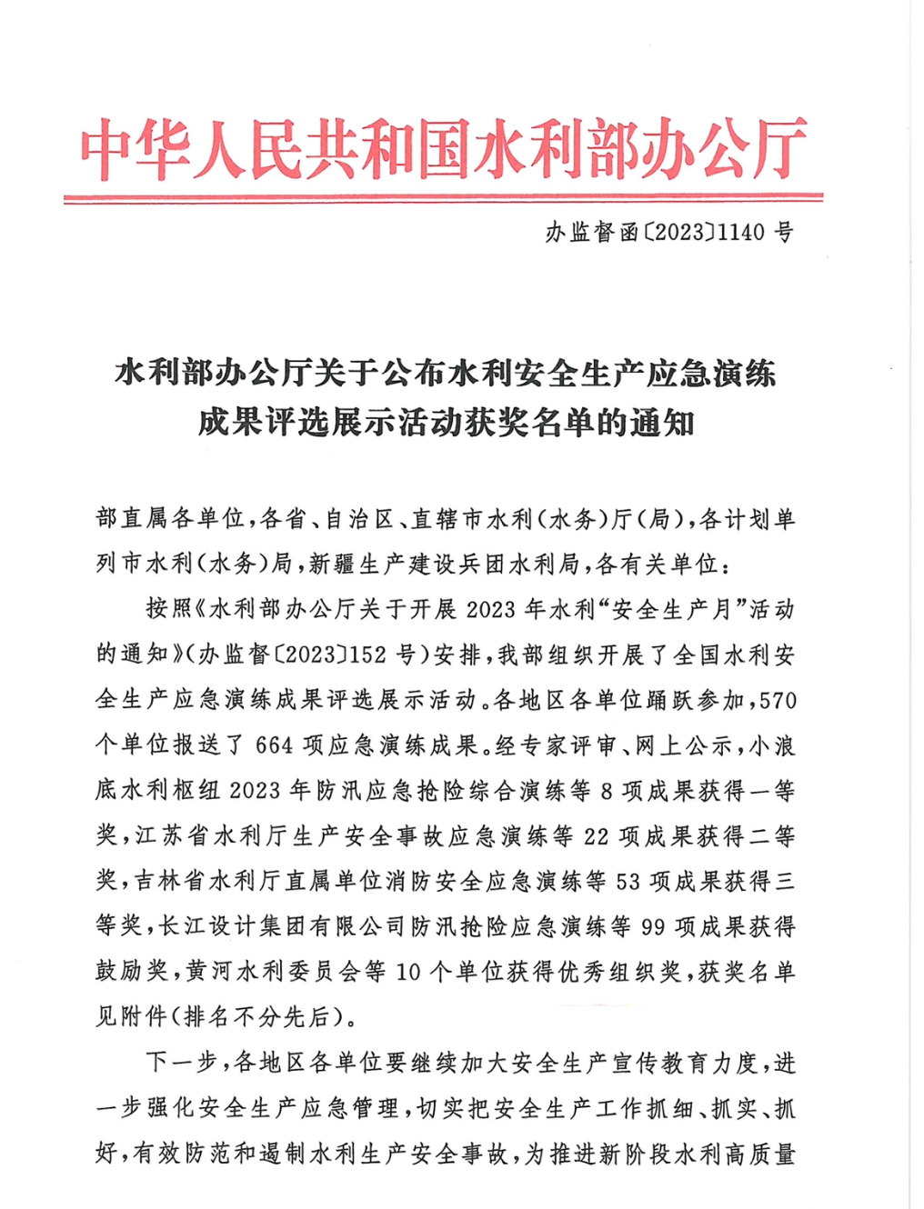 演練結(jié)束后,參演各方及時(shí)總結(jié)評(píng)估,組織專班編制演練視頻等資料,積極參加水利部辦公廳組織的2023年水利“安全生產(chǎn)月”應(yīng)急演練成果評(píng)選,喜獲一等獎(jiǎng)。