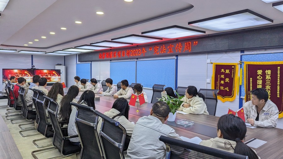 各下屬企業(yè)結合自身實際,聚焦宣傳引導,利用公司門戶網(wǎng)站、微信公眾號專欄、電子顯示屏等宣傳陣地,推送普法文章,營造濃厚宣傳氛圍;聚焦思想引領,注重發(fā)揮領導帶頭示范作用,亭子口公司組織開展“憲法宣傳周”學習會,引大濟岷公司通過總經(jīng)理辦公會會前學法,大力加強憲法學習,強化憲法意識,弘揚憲法精神;聚焦基層一線,向家壩公司在項目建設工地張貼宣傳海報,組織觀看憲法宣傳片,亭子口公司結合主題黨日活動,在項目一線進行“弘揚法治精神 助力灌區(qū)建設”普法宣教,推動憲法精神深入項目一線,擴大輻射效應。
