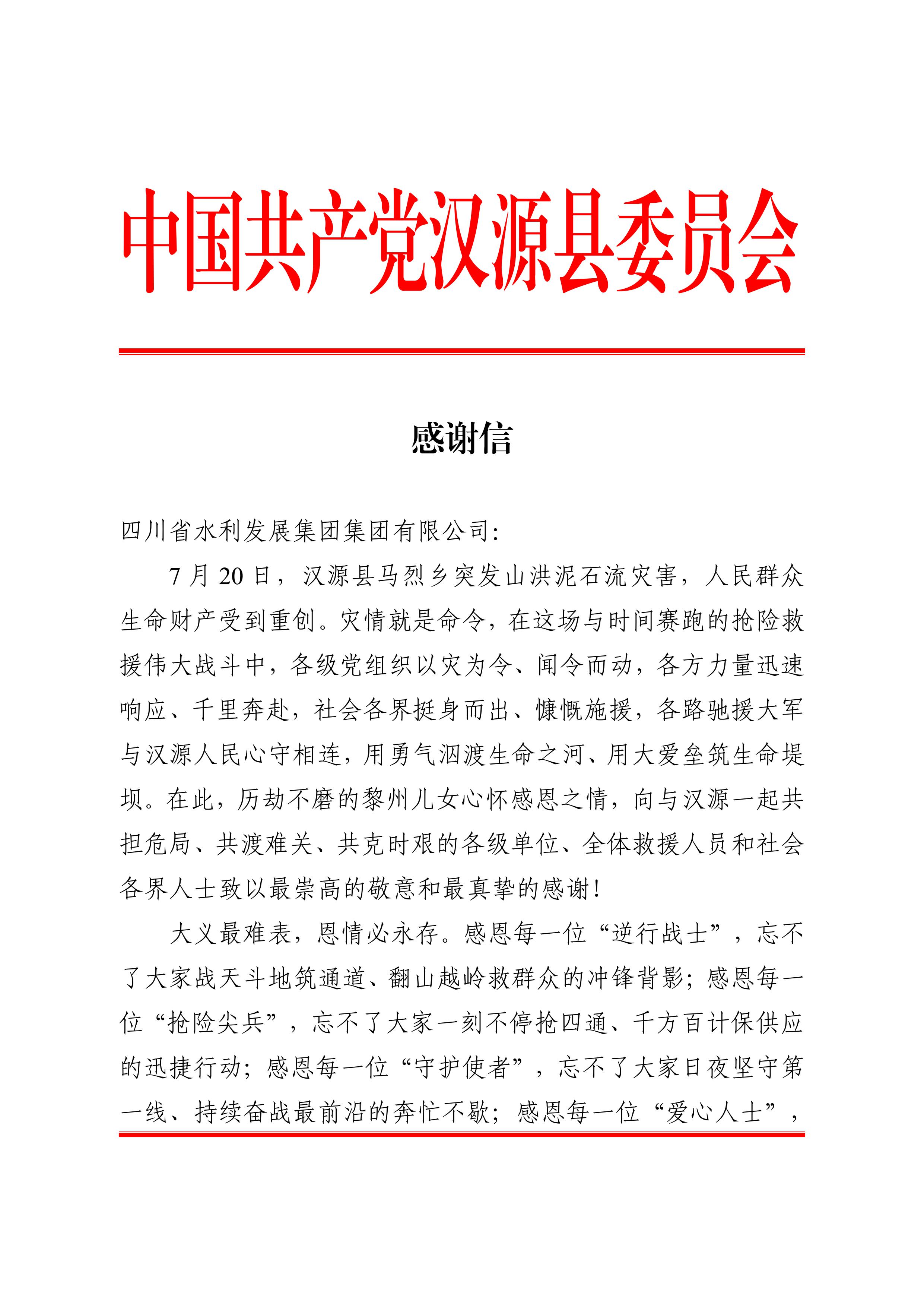 日前,集團收到來自中共漢源縣委、漢源縣人民政府的感謝信,信中對集團在“7?20”漢源縣馬烈鄉(xiāng)突發(fā)山洪泥石流災害應急搶險救災中迅速響應、行動有力表示了衷心的感謝,對搶險人員的日夜堅守和全力以赴表達了崇高的敬意。